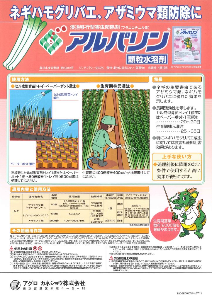 おなじみのアルバリン顆粒水和剤のネギ栽培での潅注処理が有効であるとの